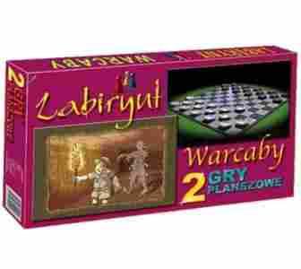 Opis produktu:W zestawie dwie gry planszowe Warcaby oraz Labirynt. Warcaby na 8 sposobów: warcaby zwykłe, uko śne, halma, amerykańskie, tureckie, jednokierunkowe, wybijanka, owca i wilk.Gra pełna przygód, niespodziewanych przeszkód i pułapek. Komu pierwszemu uda się dostać do skarbca wygrywa!Gra przeznaczona:dla 2 do 8 graczy w wieku od 4 lat.Zawartość pudełka:dwustronn a plansza, pionki, kostka, instrukcja.
