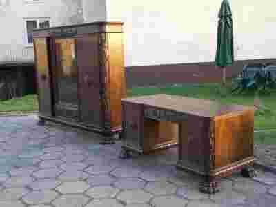 Przedmiotem aukcji jest Gabinet na lwich łapach składający się z biblioteki posiadającej szufladę i schowek z kasetką oraz piękne biurko
