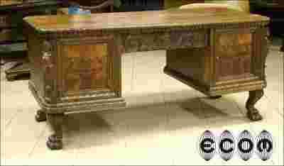 Piękne dwustronne biurko na lwich łapach z okresu międzywojennego. Krawędź blatu ze zdobieniami snycerskimi. Drzwi zdobione czeczotą orzecha, wewnątrz lewej szafki znajdziemy trzy szuflady, w prawej półkę. Front szuflady bogato ozdobiny snycerką. Na krawędziach bocznych mebla rzeźbione postacie. Całość na czterech profilownych nogach zakończonych lwimi łapami. Mebel pomimo standardowych rozmiarów i ciężkich zdobień wygląda na lżejszy, ze względu na wyższe nogi.