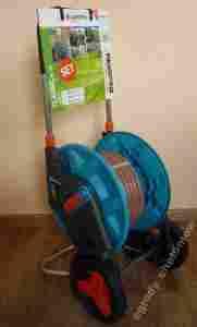Dzięki regulowanej wysokości rączki dopasowuje się do wzrostu osoby obsługującej. Skośne podłączenie węża zapobiega jego zginaniu i skręcaniu się, króciec niepożądanemu wyciekaniu wody po zakończeniu podlewania. Posiada wygodną korbę oraz duże, profilowane koła. Uchwyt wykończony materiałem chroniącym dłonie.