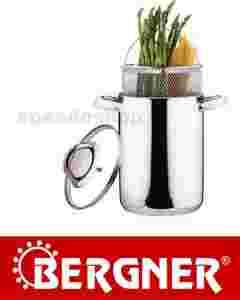 Trzyczęściowy garnek firmy BERGNER do gotowania szparagów, makaronu. Kształt, a w zasadzie jego wysokość umożliwia wygodne i bezproblemowe gotowanie szparagów, czy makaronu na spaghetti.