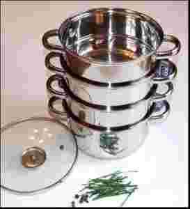 Gotowanie na parze Ten sposób przyrządzania potraw rozsławili w świecie chińczycy oraz japończycy. Doskonale zdajemy sobie sprawę z zalet tej metody tak jak przygotowane w ten sposób potrawy są najwyższej jakości pod względem zawartości witamin i minerałów. Ale czy gotujemy na parze? Nie, bo błędnie uważamy, że wymaga ona zbyt wielkiego nakładu czasu i wysiłku. Skąd taki pomysł? Cóż może być prostsze, niż wrzucić np. rybę na kosz do parowania, poczekać 9 minut, po czym włożyć ją na talerz? Nasz zestaw do gotowania na parze z pewnością każdemu w tym pomoże. W skład zestawu wchodzi : ------------------------------------------ * garnek o średnicy 20 cm. 8wysokość garnka - 11 cm. * szklana pokrywka * wkład parowy - 3 szt. * średnica wkładu 20 cm. 8wysokość wkładu - 10 cm. Komplet firmy Frico, Hoffner lub Saubach ( w zależności od stanu magazynowego ) wykonany z wysokiej jakości stali 18/10 . 3 warstwowe dno dobrze akumuluje ciepło. Nienagrzewające się metalowe nitowane na wylot uchwyty. Czyli najmocniejsze. Garnek przystosowany do gotowania na wszystkich rodzajach kuchenek w tym również i indukcyjnych. W specjalnych nakładkach na garnki, tak zwanych wkładach parowych, nie potrzebujemy już żadnych substancji ułatwiających gotowanie – bez oleju, smalcu i masła, dania stają się automatycznie lżejsze i zdrowsze. A jakby tego było jeszcze mało, nie potrzeba stać nad garnkiem i mieszać ani obracać – proces jest całkowicie samoczynny!