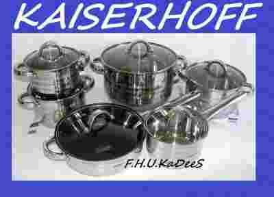 Najnowszy model garnków niemieckiej firmy KAISERHOFF. Naczynia wykonane są z wysokiej jakości stali 18/10, która jest wytrzymała, łatwa w czyszczeniu i długowieczna. GRUBE 5 WARSTWOWE DNO zapewnia szybkie magazynowanie i rozdzielanie ciepła na całą powierzchnię garnka. Solidne nitowane uchwyty zapewniają bezpieczne użytkowanie. Głęboka TEFLONOWA patelnia zapobiega przywieraniu potraw. Zestaw idealnie nadaje się na prezent !!!!!