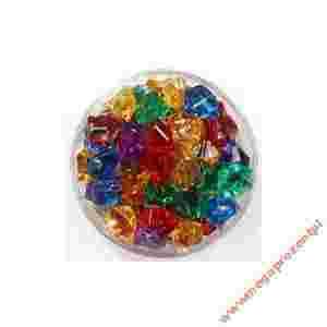 50 - 55 plastikowych kryształków zapakowanych w przezroczyste, okrągłe pudełko.