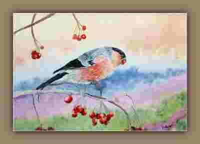 Gil i jarzębina - akwarela A4 ptaki Gal.Astry