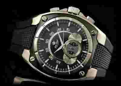 czarna lub biała, wskazówki i indeksy godzinowe srebrne lub ciemnografitowe. Wokół tarczy srebrna i czarna obwódka. Cyferblat ozdobiony dodatkowymi tarczami a koperta dwoma przyciskami.