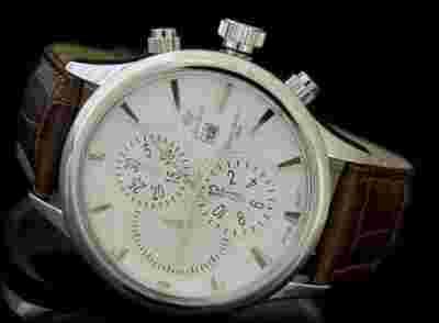 biała, wskazówki i indeksy godzinowe w kolorze srebrnym. Cyferblat ozdobiony małymi tarczami a koperta dwoma dodatkowymi przyciskami. Datownik - wskazujący kolejny dzień miesiąca.
