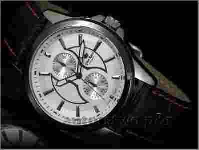 Koperta w kolorze czarno-srebrnym , tarcza biała , indeks w kolorze srebrnym - dobrze czytelny, wskazówki również w kolorze srebrnym z połyskiem . Pasek w kolorze czarnym z ozdobnymi czerwonymi przeszyciami na krawędziach , wykonany z skóry naturalnej . Szkło wypukłe- odporne na zarysowania . Chronografy na tarczy są imitacją .