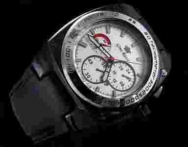 Tarcza w kolorze białym, sygnowana logo producenta. Na tarczy zamieszczono indeksy w kolorze srebrnym, wskazówki w kolorze srebrnym oraz czerwony sekundnik. Małe tarcze chronografu to ozdoby. Zegarek wskazuje godziny, minuty oraz sekundy. Zamieszczony datownik między godziną czwartą a piatą, wskazuje numery dni tygodnia.