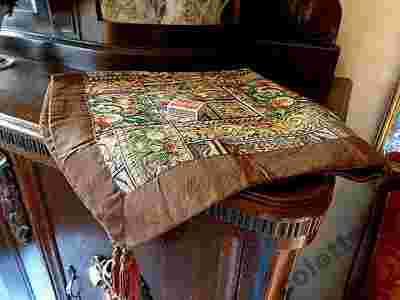 GOBELINOWA SERWETA , BRZEG WYKOŃCZONY TAŚMĄ Z MATERIAŁU W KOLORZE BRĄZOWYM I 4 CHWOSTAMI,
