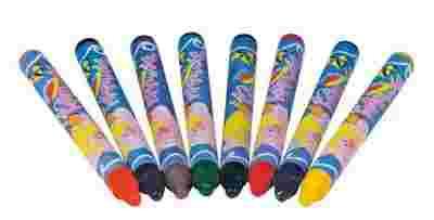 W skład zestawu wchodzi 8 kredek w kolorze: żółtym, pomarańczowym, czerwonym, zielonym, niebieskim, fioletowym, brązowym i czarnym.