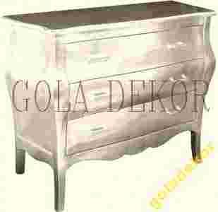 MEBEL WYKONANY JEST Z LITEGO DREWNA EGZOTYCZNEGO I POKRYTY PŁATKAMI SREBRA, WYKONANY STARANNIE I ESTETYCZNIE. UCHWYTY 3 SZUFLAD OZDBIONE SĄ "DIAMENCIKAMI"