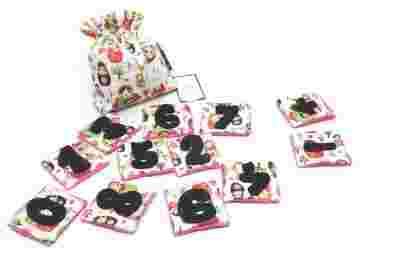 Zestaw składa się z 12 elementów z naszytymi LICZBAMI od 0 - 9 oraz + i - . Całość zapakowana w ozdobny bawełniany woreczek .