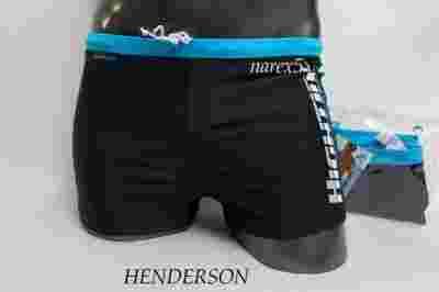 Szorty kąpielowe męskie wykonane z elastycznego materiału, wewnątrz siateczkowe slipki , w pasie szeroka kontrastująca guma , mały znaczek HENDERSON przy gumie ,dodatkowo sznureczek do ściągnięcia i regulacji a na boku kolorowy napis aplikacja.