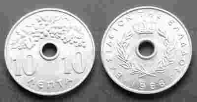 GRECJA 10 LEPTA 1966 Z DZIURĄ