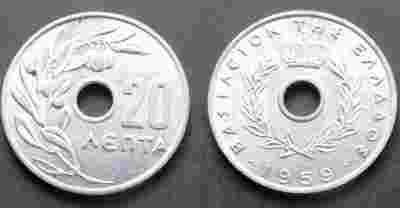 GRECJA 20 LEPTA 1959 Z DZIURĄ