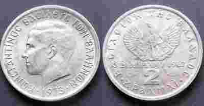 GRECJA 2 DRAHMY 1973 FENIKS I ŻOŁNIERZ TYP 4