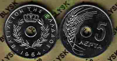 GRECJA /KM-77/ 5 LEPTA 1954 r. Z otworem