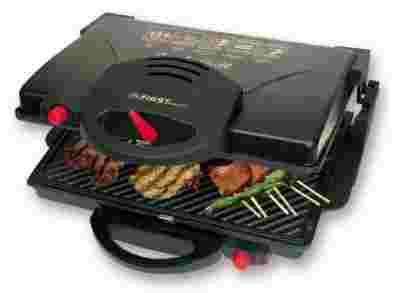 Grill elektryczny stanowi doskonałe rozwiązaniem dla osób, które chcą się uniezależnić od kapryśnej pogody. Dzięki niemu można przyrządzać grillowane smakołyki o każdej porze dnia i nocy, bez względu na pogodę i temperaturę panującą na zewnątrz. Umożliwia grillowanie na balkonie bez narażania się na uwagi i narzekanie sąsiadów. To również świetna alternatywa dla osób dbających o zdrowie, ponieważ przy pieczeniu nie wytwarza się uciążliwy dym, który podczas tradycyjnego grillowania wsiąka w potrawy. Urządzenie posiada 2 płyty grzejne pokryte powłoką teflonową, które niezależnie od siebie mogą być podgrzewane do różnych temperatur. Obróbka cieplna produktów może odbywać się zarówno na jednej płycie jak i dwóch płytach ustawionych poziomo lub jedna nad drugą. Płyty są dwustronne. Jedna strona jest gładka i nadaje się np. do smażenia jaj, natomiast druga jest rowkowana i umożliwia np. opiekanie mięs, tostów itp.