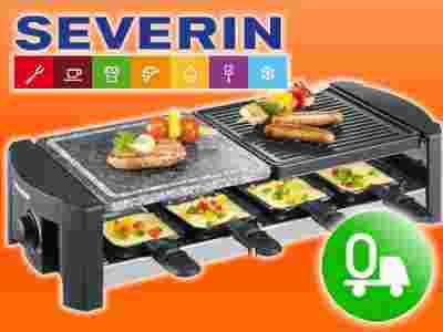 duży grill typu Raclette niemieckiej firmy Severin z łączoną powierzchnią grillowania, składającą się z płyty z powłoką nieprzywierającą oraz płyty kamionkowej