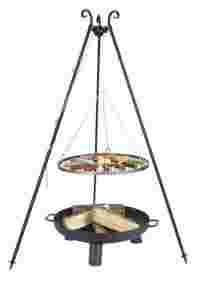 kompletny zestaw do przyrządzania posiłków nad ogniskiem. W zestawie ruszt, trójnóg wraz z kompletem ocynkowanych łańcuchów i karabińczykami do zawieszenia rusztu oraz stylowe palenisko ogrodowe.