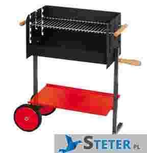 Grill został wyposażony w kółka jezdne i poręczną półkę, idelną na sztućce lub