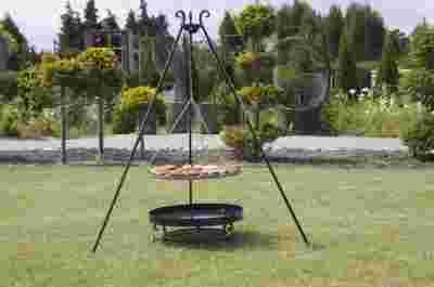 kompletny zestaw do przyrządzania posiłków nad ogniskiem. W zestawie ruszt, trójnóg wraz z kompletem ocynkowanych łańcuchów i karabińczykami do zawieszenia rusztu oraz stylowe palenisko ogrodowe.