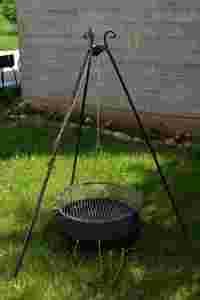 Idealny na działkę, do ogrodu itp. Produkt Polski !!! GRILL posiada trójnóg - każda z nóg składana w połowie. Kolor czarny - elementy malowane proszkowo. GRILL jest wyposażony w palenisko zdobione o średnicy 60 cm. RUSZT o średnicy 60 cm. Uchwyt do regulacji wysokości rusztu oraz kołowrotek na górze
