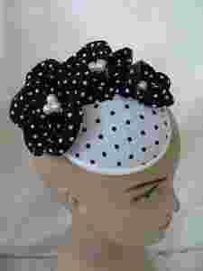 Groszka wizytowy toczek- fascynator z tkaniny w groszki w bieli i czerni.