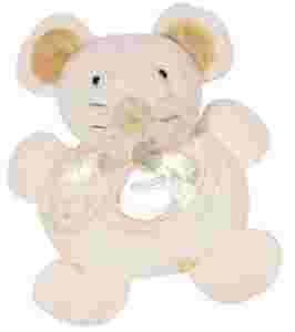 Pluszowa grzechotka w kształcie okręgu z uśmiechniętą myszką, przyjazna dzieciom i przyjemna w dotyku.