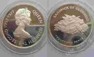 GUERNSEY 25 PENCE 1977 SILVER JUBILE SREBRO PROF