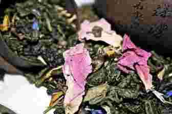 Chińska herbata typu Gunpowder z dodatkiem płatków nagietka , chabru , róży oraz z kawałkami rodzynek o naturalnym aromacie .