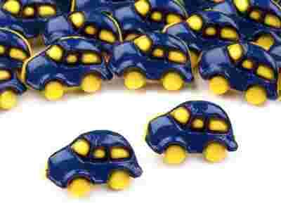 Na tej aukcji kupisz plastykowe guziki w kształcie samochodzików w kolorze granatowym z żółtymi detalami. Guziki mają średnicę 11mm. Posiadają oczko do przeszycia umieszczone od spodu.