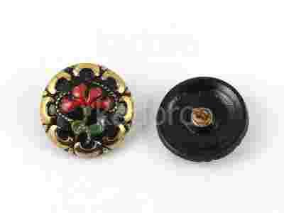 Szklane, czeskie, ręcznie malowane guziki o średnicy ok. 22.5-23 mm z mosiężną stopką. Ze względu na ręczne wykonanie poszczególne egzemplarze mogą nieznacznie się różnić między sobą.