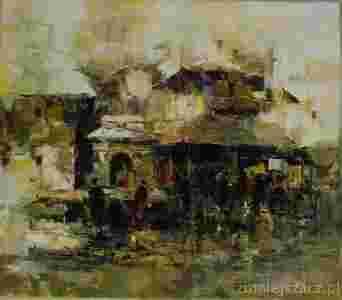 Mam do sprzedania obraz nepalskiego artysty Gyanmaniego Raya. Zakupilam go w jednej z galerii w Bhaktapur podczas tegorocznej (sierpien/wrzesien) wyprawy po Nepalu. Obraz przedstawia Durbar square w swietym miescie Bhaktapur (wczesnej stolicy Nepalu) z typowa forma architektoniczna pagody. Z cala pewnoscia, obraz robi wrazenie i przykuwa uwage kolorystyka (przenikanie sie jasnych i ciemnych kolorow, co z zamyslem malarza-wychowanego w duchu filozofii wschodu, ma symbolizowac przeplatanie sie dobrych i zlych, mrocznych i jasnych, pieknych i brzydkich aspektow rzeczywistosci), struktura (szpachlowy sposob nakladania farby i fakt, ze artysta fragmentarycznie pokryl plotno nepalskim, recznie wyrabianym, surowym papierem Lokta, co tworzy miejscowe zgrubienia, uwypuklenia i nadaja dzielu swoistego charakteru) oraz orientalna tematyka.