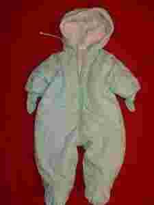 Bardzo ładny i ciepły kombinezon w kolorze seledynowym, jasnej mięty?, rękawy zakończone "niedrapkami", karczek z przodu lekko przymarszczony i ozdobiony stebnówką, podobnie jak zakończenie nogawek - spody "bucików"- foto. nr 4 i 5.