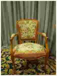 Fotel tapicerowany-tkaniną gobelinową w kwiatowy motyw.