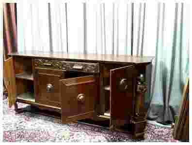 Mebel dębowy w kolorze ciemnego dębu, boczne drzwiczki z orzechowym fornirem.