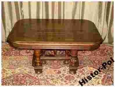 Ława niska niczym mebel kolonialny z pełnego drzewa na ślicznej podstawie i kolumienkach tworzących podstawę ławy kwadratowej .