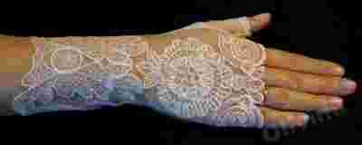 Rękawiczki wykonane są z bardzo miękkiego i niedrapiącego tiulu tkanego. Całość ozdabiają haftowane ornamenty oraz ręcznie przyszywane kryształki.
