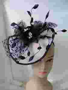 Toczek z organzy mlecznej w kolorze śmietankowej bieli z czarną dekoracją z kwiatów, liści, tiulu w grochy.