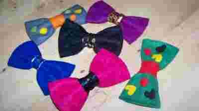 Urocze, robione własnoręcznie broszki w kształcie kokardy.