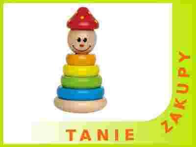 Kolorowy klown. Wykonany z drewna uśmiechnięty klaun to edukacyjna zabawka dla najmłodszych polegająca na wkładaniu na drążek kolorowych kółek.