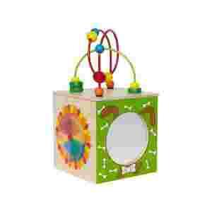 Drewniana skrzynka odkrywcy. Kuleczki można przesuwać po pokręconych spiralkach labiryntu, spróbuj je przesunąć, a zobaczysz jakie to łatwe.