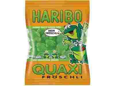 HARIBO QUAXI to pyszne żelki w kształcie żabek o strukturze żelkowo-piankowej (zielony żelek na górze pianka na dole).