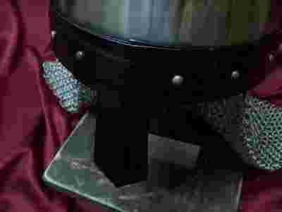 Wysokiej jakości replika hełmu normańskiego, powszechnie używanego w większości Europy. Skala 1:1, spokojnie może służyć nie tylko jako eksponat ale brać udział w rekonstrukcjach historycznych - nadaje się do walki. Hełm wykonany z metalu, podobnie kolczuga na szyję stanowiąca cłaość. W cenę nie jest wliczony stojak i dedykacja widoczne na zdjęciach, można je nabyć na innej naszej aukcji.