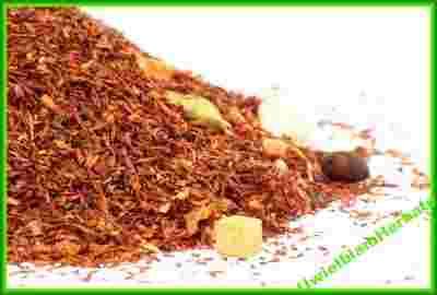 - Jedna z bogatszych wersji rooibosa, kombinacja herbaty z toffee, różą, jeżyną, białą czekoladą, imbirem, truskawką, kardamonem...i wieloma innymi, tworzy wyjątkową w smaku kombinację którą ciężko jakkolwiek określić, na pewno trzeba jej spróbować. Sam rooibos nazywany czerwoną herbatą, tak naprawdę nie ma z nią nic wspólnego. Pochodzi z Ameryki Południowej a do przygotowania suszu wykorzystuje się kawałki czerwonych listków i łodyżek czerwonokrzewu. Nie zawiera kofeiny, jest za to bogaty w witaminę C, sole oraz proteiny. Napar bardzo specyficzny, o kolorze ciemnego mahoniu, w smaku wyraźny o lekko cytrynowej nucie. Nie występuje w nim charakterystyczny dla herbat czarnych czy zielonych posmak goryczki. Po dodaniu cukru, najlepiej kandyzowanego, w smaku wyczuwa się posmak miodu. Rewelacyjny jako napój gorący jak również podany na zimno. Nie zawiera kofeiny dlatego jest idealnym napojem dla dzieci i kobiet w ciąży (dzięki zawartości substancji zapobiegającym mdłościom). Swoimi właściwościami dościga herbaty typu Pu-erh.