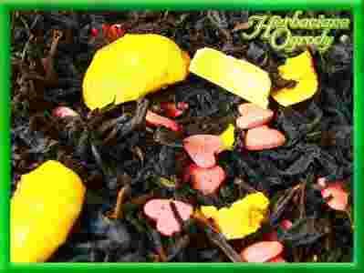 Czarna herbata liściasta z dodatkiem liofilizowanego owocu róży, cukrowych czerwonych serduszek oraz aromatu.