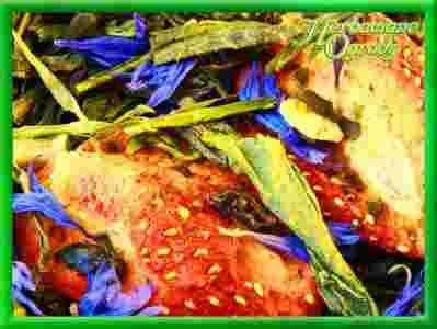 Herbata Sencha z niewielkim dodatkiem Herbaty Gunpowder, owocem kiwi, banana, truskawki, płatkami kwiatu bławatka i egzotycznym aromatem.
