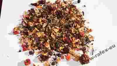 SKŁAD: hibiskus, jabłko, tarninę, aronię, śliwkę, malinę, czarny bez, wiśnię, skórkę pomarańczy, ananasa, rodzynki, zieloną herbatę Sencha, płatki słonecznika i ślazu, aromat banana i brandy.